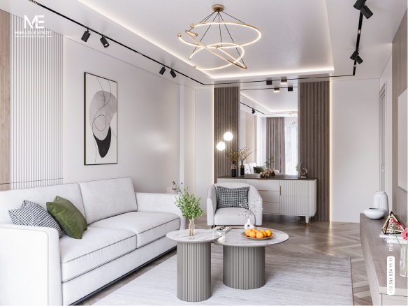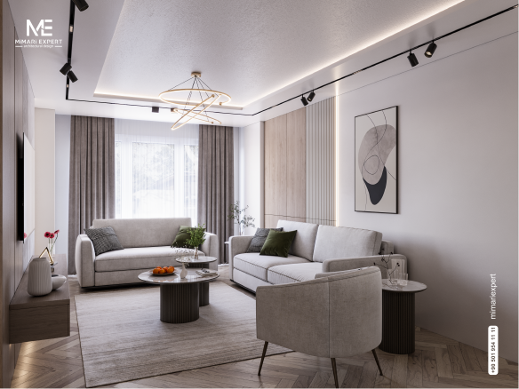 This elegant interior design for an apartment in Akca Palaces in Istanbul features a beautiful blend of neutral colors and natural materials. The walls are adorned with wooden details and smooth gray surfaces, creating a calm and relaxing atmosphere. The furniture reflects luxury and functionality, with a round marble-topped coffee table and botanical decorations adding a lively touch to the space. Innovative lighting is well-distributed, with a modern chandelier enhancing the overall design of the room. The wall-mounted TV saves space and adds a contemporary touch. Overall, this design combines elegance and comfort in perfect balance, making the apartment ideal for modern living in the heart of Istanbul.